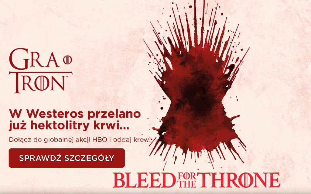 W ciągu siedmiu minionych sezonów niejeden z bohaterów Gry o tron przelał krew. Wielu z nich oddało wręcz dla tronu życie… Teraz, w przededniu premiery ósmego, finałowego sezonu tej kultowej produkcji, HBO zachęca wszystkich, nie tylko jej najbardziej zagorzałych fanów, do połączenia sił i wspólnego zaangażowania się w akcję, która ma na celu zebranie jak największej ilości krwi ratującej życie. Wszystko pod nazwą Bleed For The Throne – oddaj krew!